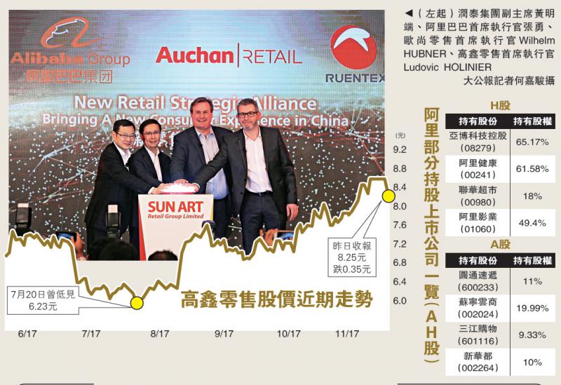 阿里巴巴同時宣布,與高鑫零售兩名股東歐尚零售及潤泰集團達成新零售戰略合作聯盟,高鑫零售將借力阿里巴巴的數字生態系統,推進門店數字化,並將新零售解決方案應用於高鑫門店,包括線上線下一體化、現代物流及個性化消費者體驗。交易完成後,歐尚零售、阿里巴巴及潤泰集團分別持有高鑫零售36.18%、36.16%及4.67%股權。