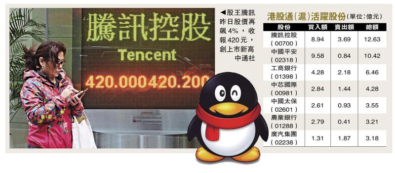 圖:股王騰訊昨日股價再飆4%,收報420元,創上市新高/中通社
