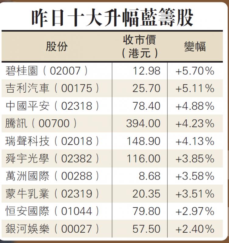 股王騰訊及中國平安股價昨日急彈近半成,各自收報394元及78.4元,分別是第四及第三大升幅藍籌股,並是推動恒指急彈的主要原因。碧桂園升5.7%,收報12.98元,為最佳表現藍籌;吉利(00175)升5.11%,收報25.7元,為第二大升幅藍籌股。港交所(00388)、友邦(01299)均升逾1%,分別報227.4元及61.8元;滙控(00005)升0.27%,收報76.8元。