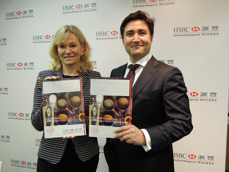 圖:滙豐環球投資管理推出新基金。圖為滙豐環球基金經理David NcNay(右)與香港及中國分銷業務主管白韋恩(左)\大公報攝