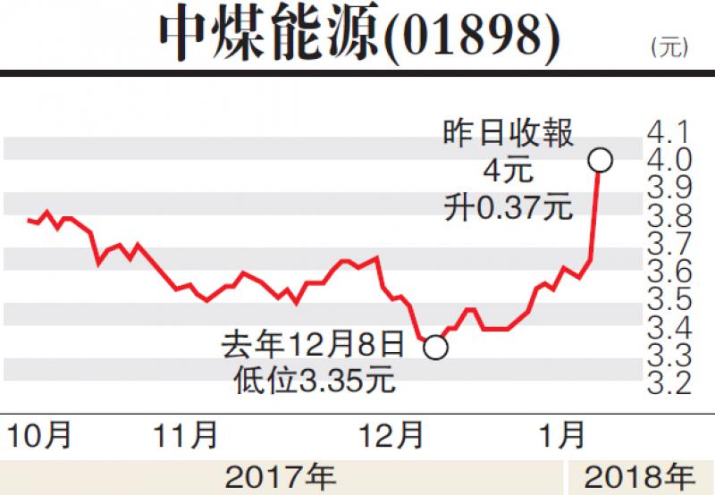 自去年12月份起,煤炭股份表現強勢,其中中煤能源(01898)在三大煤股之中表現最落後,短線順勢追入,值博仍高。受惠煤炭行業去產能政策,集團去年業績大幅改善,截至2017年9月底止首三季,收入上升44.1%至597.93億元人民幣,純利上升1.7倍至24.32億元人民幣。近日發改委亦發布推進煤企兼併重組轉型升級意見,並發展煤電聯營等,集團料可受惠。