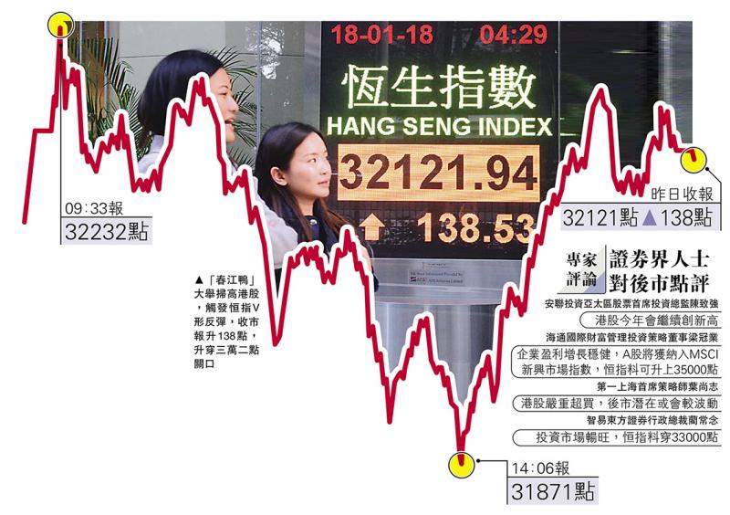 圖:「春江鴨」大舉掃高港股,觸發恒指V形反彈,收市報升138點,升穿三萬二點關口