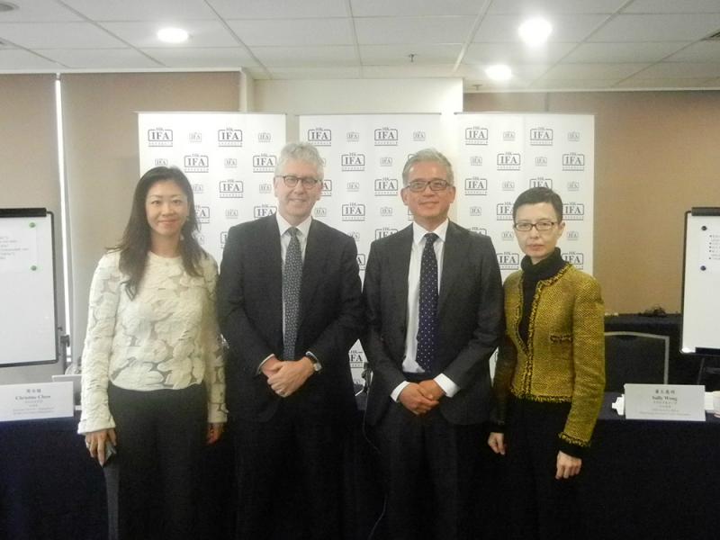 圖左起為Hermes投資管理副總監周尚頤、摩根資產管理投資總監(股票)Jonathan Lowe、荷寶資深治理專家及投資組合經理林福仁,以及香港投資基金公會行政總裁黃王慈明