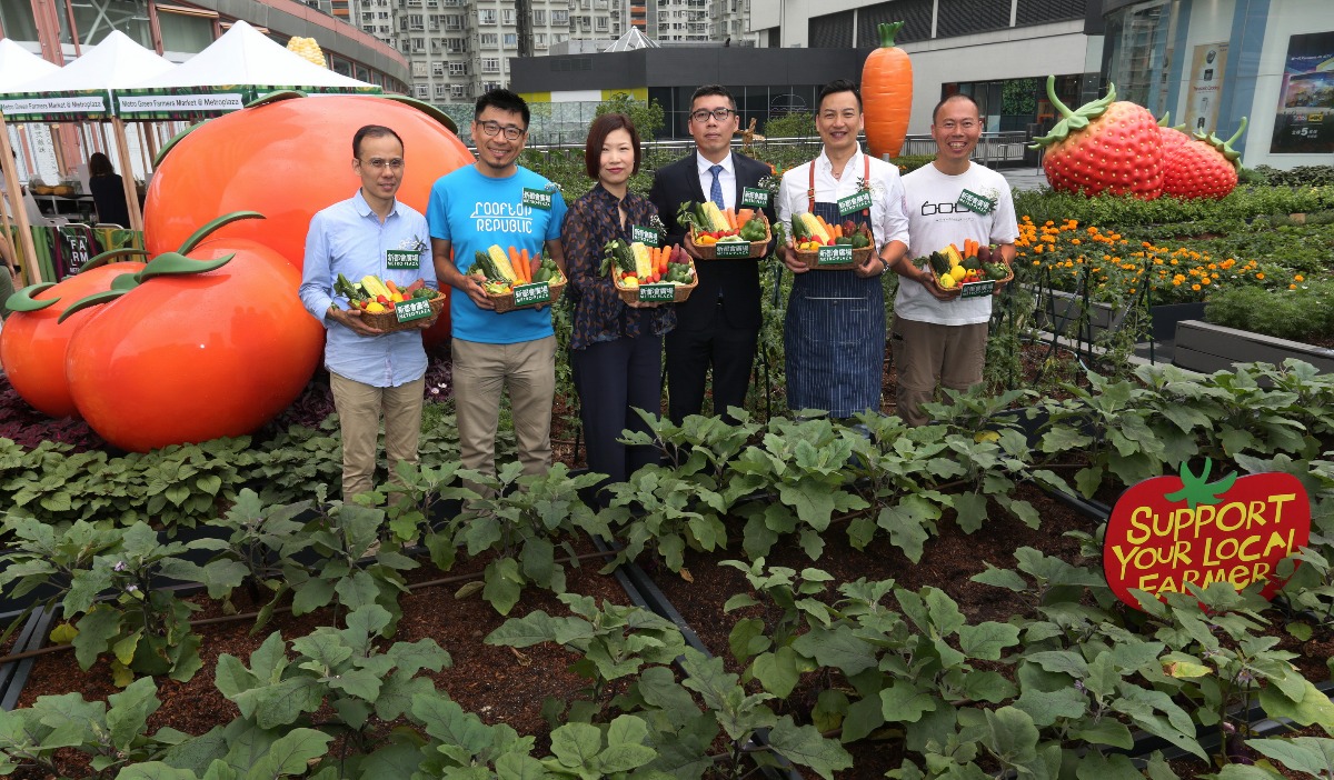 新都會廣場全新都市農莊開幕。(左起) Green Monday Chief Foodie Officer 陳鑑昌,雲耕一族聯合創辦人徐伽,新地代理租務部(推廣)助理總經理陳潔儀,新地代理租務部高級租務經理李德興,星級廚師余健志及香港有機生活社社長黃如榮。