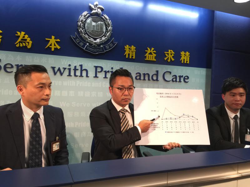 圖:東九龍總區重案組總督察譚威信(中)講述電話騙案情況 大公報記者陳卓康攝