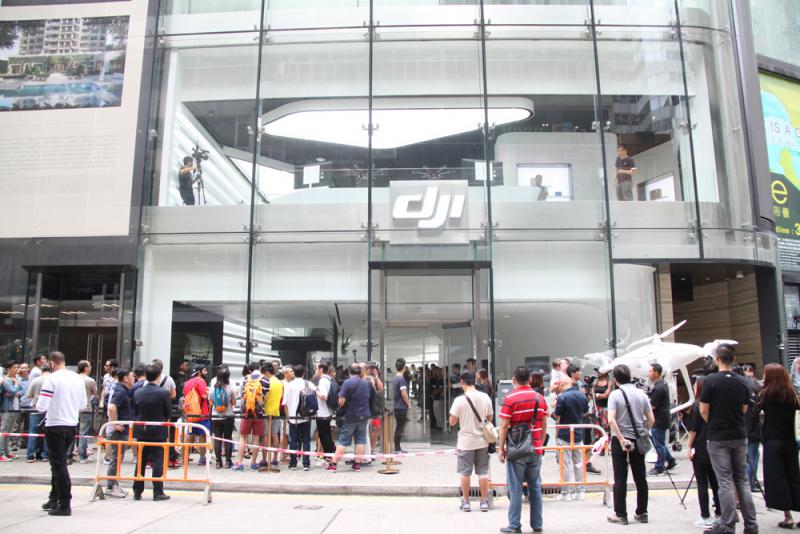 圖:大疆在港設旗艦店,昨日開張吸引大批航拍機愛好者排隊進店購買\中央社