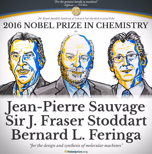 大公網訊 10月5日(記者劉家莉) 2016年諾貝爾化學獎於本港下午5時45分揭盅,三位得主分別為法國學者Jean-Pierre Sauvage,美國學者Sir J. Fraser Stoddart,以及荷蘭學者Bernard L. Fergina,他們以研究「分子機器的設計和合成」獲獎。