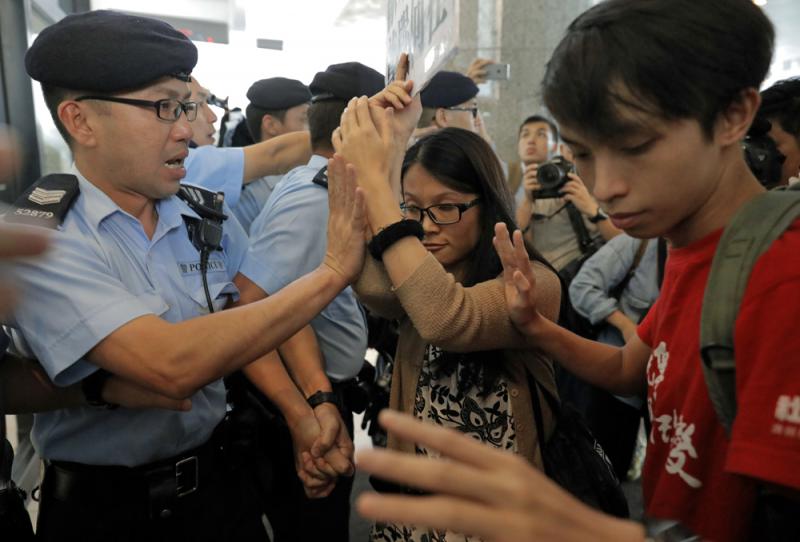 圖:香港眾志昨中午到泰國駐港總領事館抗議,警員在場維持秩序\美聯社