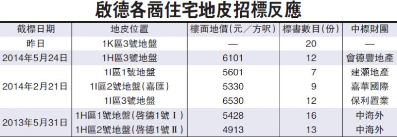 因此,該幅1K區地皮,吸引20多家本地及內地實力雄厚的發展商,以獨資或合組財團方式參與爭逐。政府為此地共收到20份標書,該區2013年至今共推出的7幅商住地中,最受熱捧的一幅,亦是過去一年來最多財團入標的一幅商住及住宅地皮。