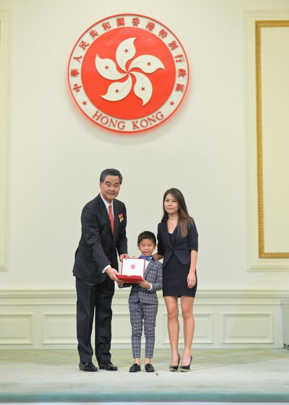 今年六月,九龍灣淘大工業村發生迷你倉四級火,消防隊目許志傑及高級消防隊長張耀升英勇殉職,獲追授金英勇勳章,行政長官梁振英昨在禮賓府,將金英勇勳章交予許志傑太太吳安兒及兒子許珀僑。消防英雄捨己精神感動每一位市民,授勳也象徵香港再一次向英雄致敬。