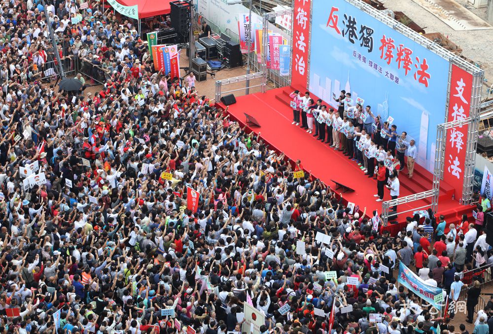 「反港獨!撐釋法!」逾千個團體、超過五萬名市民昨日在立法會外集會,透過強而有力的呼聲,向青年新政梁頌恆和遊蕙禎辱華播「獨」惡劣行徑表達強烈不滿,衷心擁護人大釋法撥亂反正,驅除「港獨」。主辦是次集會的「反港獨、撐釋法」大聯盟表示,活動清晰展現了全港廣大市民,特別是青年人維護法治精神的決心和意志,絕不容許任何人在立法會搞「港獨」、辱國家。/大公報記者 文軒