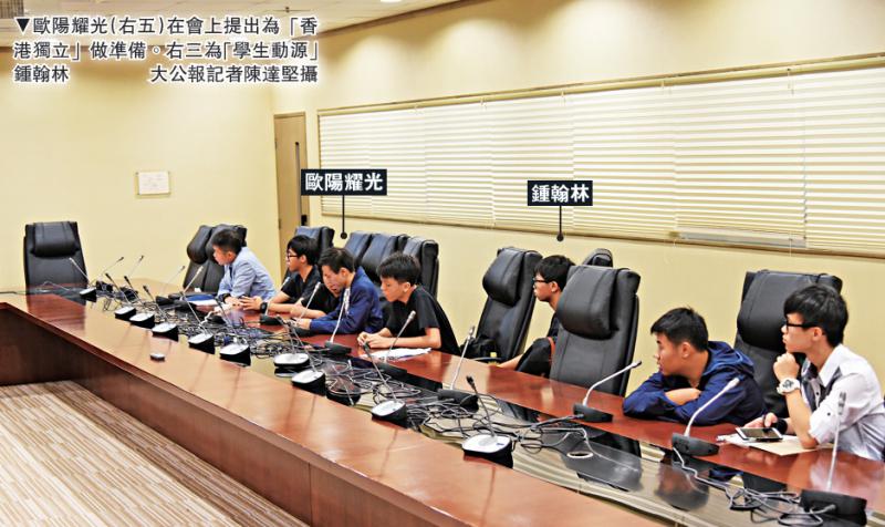 圖:歐陽耀光(右五)在會上提出為「香港獨立」做準備。右三為「學生動源」鍾翰林/大公報記者陳達堅攝