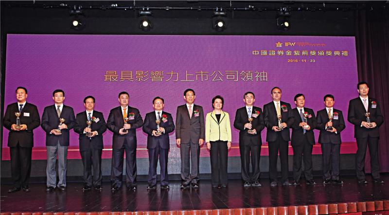 圖:第六屆中國證券金紫荊獎「最具影響力上市公司領袖」頒獎儀式昨日舉行,中聯辦副主任仇鴻(左七)頒獎並與獲獎者合照。左起:北京汽車集團有限公司董事長徐和誼,中國華融資產管理股份有限公司董事長賴小民代表、辦公室主任李迎春,中國工商銀行股份有限公司董事長易會滿代表、副行長胡洗,北京同仁堂國藥有限公司董事長梅群,中國鐵路通信信號股份有限公司董事長周志亮,大公文匯傳媒集團董事長姜在忠,中國電力建設股份有限公司董事長晏志勇,中國機械設備工程股份有限公司董事長孫柏,招金礦業股份有限公司董事長翁占斌,中國海洋石油有限公司董事長楊華代表、首席財務官鍾華,蘇寧雲商集團股份有限公司董事長張近東代表、香港區總經理徐耀華