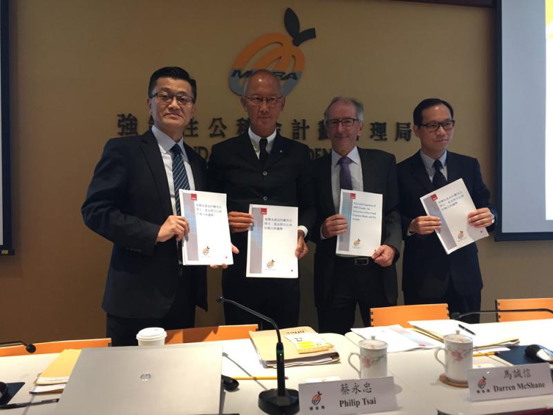 圖:積金局發表與基金費用及開支趨勢報告,非執行董事蔡永忠(左二)認為減費仍「不夠快、不夠深」 大公報記者張月琪攝