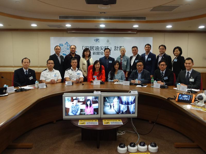 圖:油尖旺滅罪委員會免費為大廈安裝防盜閉路電視系統。前排左起:旺角警區署理高級警司余偉傑、油尖區總警司郭柏聰、油尖區滅罪會主席陳香蓮、影星米雪、工作小組負責人黃萬成、莊毅強 大公報記者陳卓康攝
