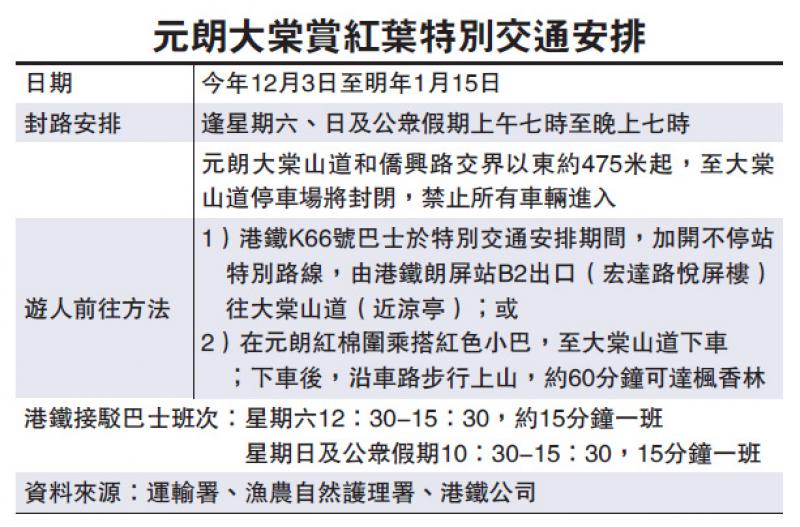 為應付觀賞紅葉人潮,運輸署由今日起至明年1月15日,將在該處實施特別交通安排,逢周六、日和公眾假期,由上午七時至晚上七時,運輸署將在元朗大棠山道和僑興路交界以東約475米外至大棠山道停車場,實施交通管制措施。港鐵亦在這段期間提供不停站特別路線,由港鐵朗屏站直達大棠山道。因應觀賞紅葉市民近年愈來愈多,漁護署今年首次舉辦紅葉觀賞團,由明日起至明年一月八日,逢星期日及公眾假期將舉行,由有義工提供紅葉導賞、紅葉手工工作坊、紅葉知多少攤位遊戲及「自己垃圾,自己帶走」相片展覽。