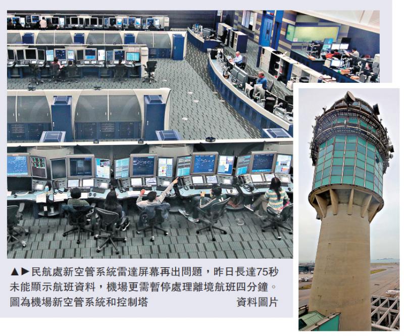民航處的新空管系統雷達屏幕再次出問題。昨日中午時分,長達75秒未能顯示航班資料,機場需暫停處理離境航班四分鐘。民航處稱,故障是由於有空管人員進行系統保養工作時,並無跟從指引,令系統數據短暫未能與雷達資料配對,並非系統出現新問題。雷達屏幕未能顯示航班資料期間,空管人員可透過近日新實施的衛星導航監察技術(ADS-B),掌握全部航班資料,事件沒有影響航空安全。/大公報綜合報道