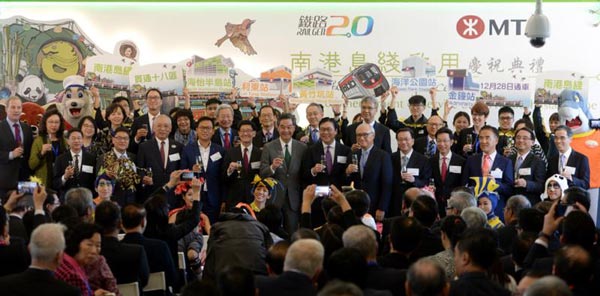 港鐵昨日在海洋公園站舉行南港島線啟用慶祝典禮,數百嘉賓獲邀出席,行政長官梁振英、運輸及房屋局局長張炳良、港鐵主席馬時亨等主持啟用儀式。梁振英致辭時稱,鐵路是理想的公共交通工具,自己是當之無愧的鐵路服務「粉絲」。南港島線落成是南區居民的喜事,因以往居民出行,主要依靠陸路交通,若香港仔隧道擠塞,對居民出行有影響。南港島線下星期開通後,由海怡半島前往金鐘只需11分鐘,比現時所需的15至45分鐘大大縮短。