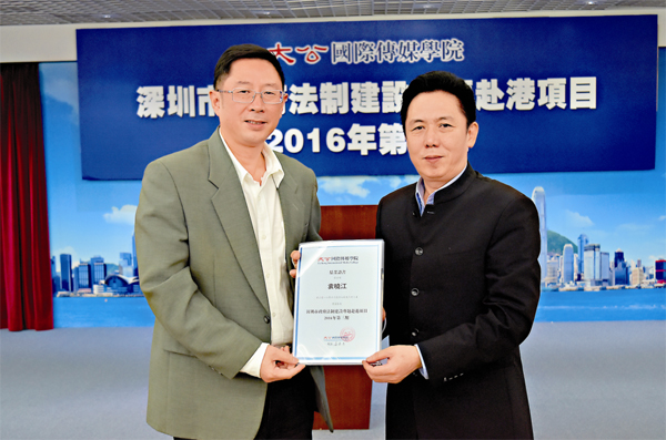 香港大公文匯傳媒集團副董事長兼總經理歐陽曉晴(右)於結業式上,向深圳市市委黨校校委委員袁曉江頒發證書。