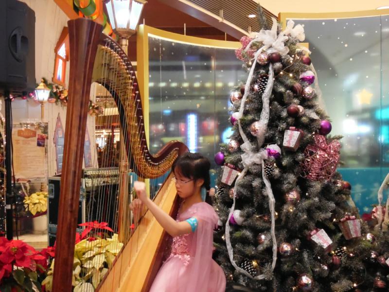 圖:張曦怡參與豎琴演出,與市民歡度聖誕 大公報記者黃穎雅攝