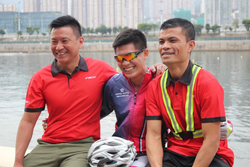 圖:左起:消防隊目林家輝、消防隊長王洪烈以及視障人士朱健驊(朱仔),透過單車活動成為朋友