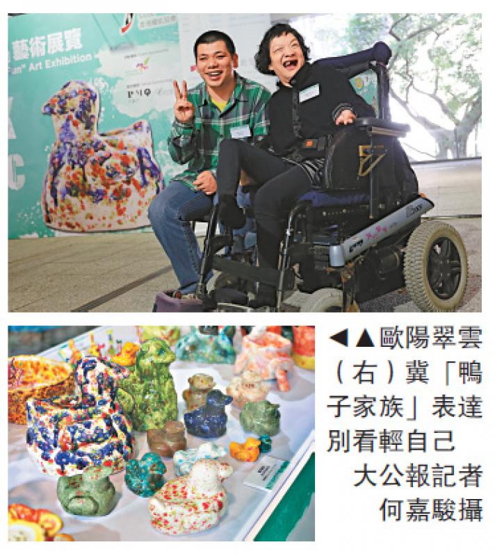 【大公報訊】記者徐曉彤報道:醜小鴨雖然身處惡劣環境,又受盡周邊的冷眼,但抱着永不放棄的精神,終變成美麗的天鵝。53歲的痙攣人士歐陽翠雲亦自喻為醜小鴨,縱然自小失去雙手的活動能力,但亦不畏困難,用雙腳創作出一系列名為「鴨子家族」的陶瓷藝術品,她希望透過作品,向社會發放不要輕看自己的信息。