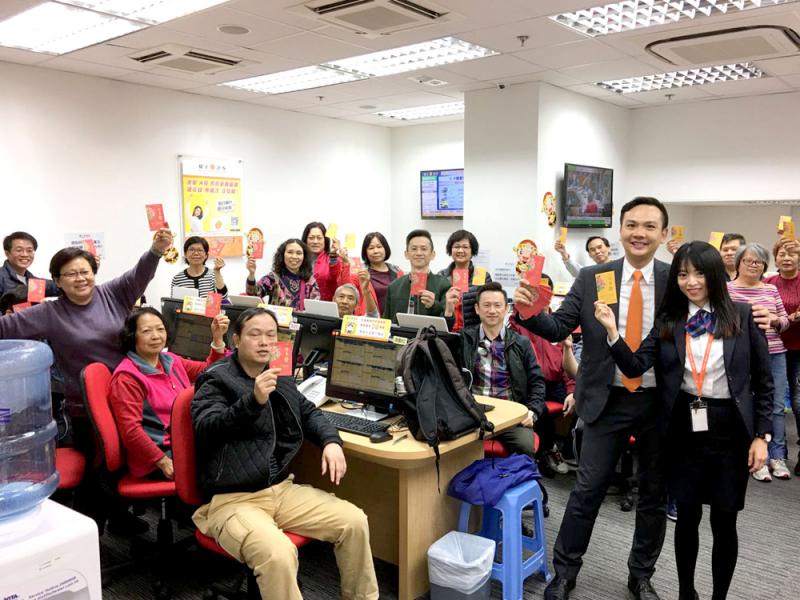 圖:「耀才證券」每年均會在農曆新年首個交易日,走遍全線20間分行,大派開運利是給所有客戶