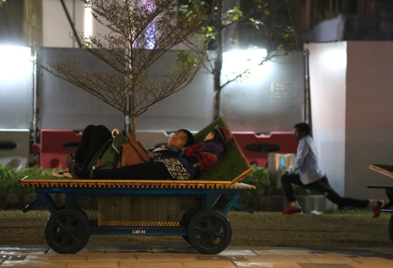 這邊廂,仿若車子的長櫈上,情意綿綿的愛侶,靜靜躺下,溫馨賞月。