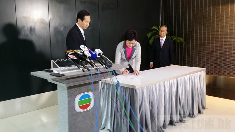 圖:林鄭月娥昨日到TVB參與節目錄影前簽署承諾書,表明自己不屬於任何政黨。陳智思(左)以太平紳士身份作見證