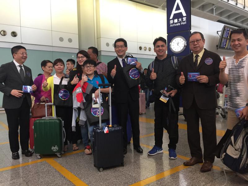 圖:商經局局長蘇錦樑(右四)昨日在香港國際機場向旅客派發「慶祝香港特別行政區成立二十周年禮遇精選」小冊子和紀念品\大公報記者謝進亨攝