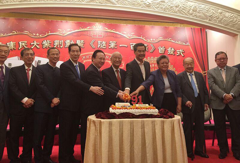 圖:梁振英(右四)、譚鐵牛(右六)等人出席吳康民(右五)《隨筆一百篇》新書首發式