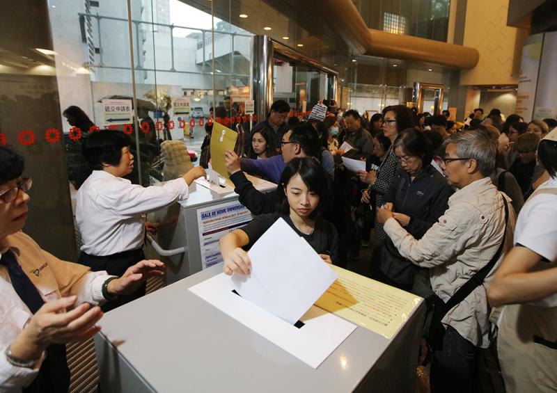 【大公報訊】記者曾敏捷報道:樓市熾熱,全城瘋搶居屋。新一期居屋昨晚截止申請,房屋委員會樂富客務中心累計收到7.9萬份申請,超額認購37倍,若以當局派出15.6萬份申請表推算,今期居屋申請預料刷新2015年首批新居屋近13萬份的最高紀錄。最後衝刺日,房委會客務中心交表的人潮絡繹不絕,有大學生未畢業已遞表買居屋;有單身人士「屢敗屢戰」第四度申請居屋,「大澳居屋我都抽過,抽中梅窩都好啊」。