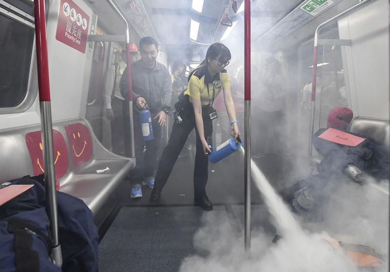 圖:港鐵昨日凌晨舉行演習,模擬有乘客攜帶的物品着火,港鐵職員啟動疏散程序