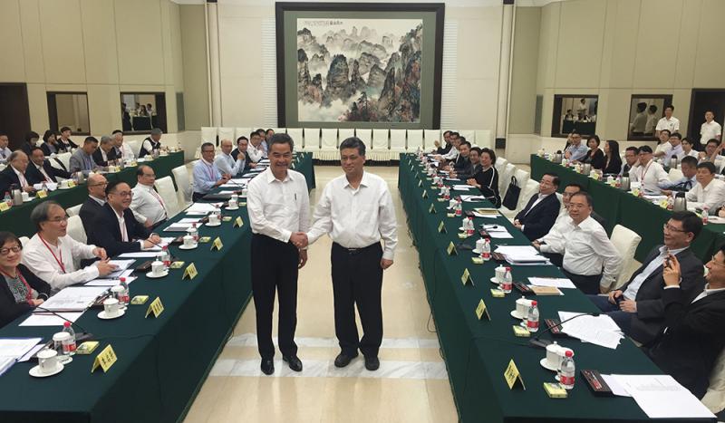 圖:行政長官梁振英(左)與廣東省省長馬興瑞在粵港澳大灣區座談會前握手/大公報記者黃寶儀攝