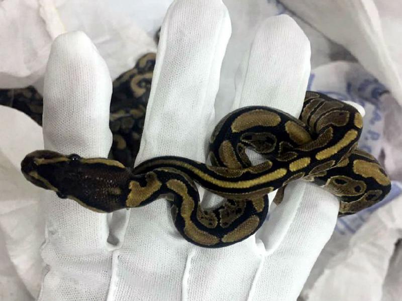關員攔住旅客,查驗後發現背包內裝有98條活體蛇,名叫「球蟒」。這些長度不到20厘米,表皮大部分為黑色或灰褐色,帶有棕黃色的條狀清晰斑紋。據了解,「球蟒」原產於非洲,是一種小型無毒蟒蛇,以小型哺乳動物(如小老鼠)為食,天性溫順膽怯,目前被一些愛好者作為「觀賞寵物」飼養。