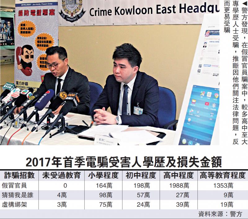 圖:警方發現,在假冒官員騙案中,較多高中至大專學歷人士受騙,推斷因他們關注法律問題,反而更易受騙