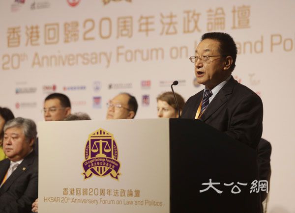 他又指,在大是大非的重大原則問題上,法學人應立場堅定,態度鮮明,不應該動搖。維護法治是香港未來繁榮穩定的前提,是重要基礎,要做到準確實施基本法,香港法律界和內地法律界責任重大。香港經過20年的發展,正處於非常關鍵的時期,條件和機遇並存,希望香港的法律界可以繼續堅持「一國兩制」的方針,準確推動基本法。
