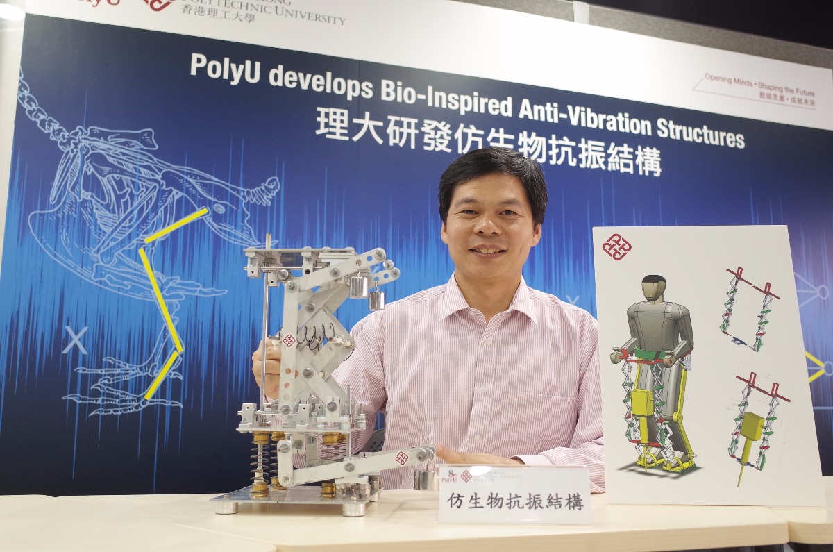 理大機械工程學系副教授景興建領導研究團隊,參考不少動物減弱振動的肢體關節結構,研究出非線性結構系統,能減低各類機械系統產生的振動。非線性抗振結構有三大優點,包括對任何振動均產生接近「零反應」、高負載能力,以及在較強振動下消耗能量自動調高,在小幅振動時則自動調低消耗能量。景興建團隊已為這創新結構取得專利,並將之應用於手提鑽鑿路面工具。