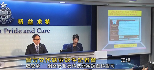 香港警方15日下午召開記者會,交代加密勒索軟件「WannaCry」相關情況 電視截圖