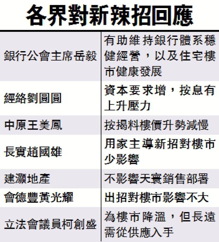 【大公報訊】記者梁穎賢報道:金管局出招,綜合市場認為對整體樓市無大影響,唯有關招數勢必將購買力進一步推向有財務安排的新盤,二手再處於被動,料上車難上加難。