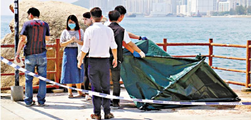 鯉魚門馬環村石灘近岸處,昨清晨有一名中年肥胖男子在海面浮沉,其後證實氣絕身亡。警員發現死者雙手手腕綁上尼龍繩,左手繩綁上石頭,而右手所綁的一塊,相信是墮海後甩脫。一度懷疑事件另有別情,稍後尋來死者妻子到場助查後,相信事件無可疑。有街坊表示,懷疑事主落海摸硯時以石塊固定位置,意外遇溺身亡。圖為女親人到場認屍及死者岸上留下衣物。 大公報記者周慶邦(文/圖)