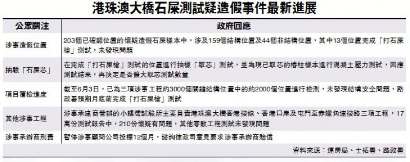 港珠澳大橋香港段工程石屎測試涉嫌造假,政府首次披露涉及210個可疑樣本,當中159個樣本涉及結構位置,部分是地底及水底樁柱。路政署在其中13個位置完成「打石屎槍」測試,暫未發現問題,稍後會安排抽驗「石屎芯」,並在通車前為全橋進行負重載荷測試。運輸及房屋局局長張炳良透露,上月19日才獲悉事件,但強調政府處理事件無「嘆慢板」,並預期事件不會延誤港珠澳大橋通車,亦毋須申請額外費用。\大公報記者 曾敏捷