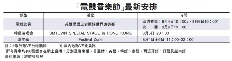 將於八月四日至六日舉行的首屆「香港電競音樂節」,包括有「王者回歸」電競邀請賽、韓星音樂會與嘉年華會,原選址在中環海濱舉行,主辦方旅發局其後決定更改地點,昨日宣布移師紅館內,嘉年華則在紅館外的平台舉行。新場地可容納約7000人觀賞電競賽事,與原計劃相若;惟韓星演唱會觀眾名額則由1.3萬人減至7000人,原計劃全是企位,現改為全是座位。