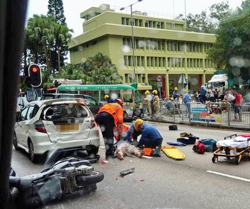 圖:西貢公路鐵騎士被撞後倒地重傷,消防及救護員在現場急救/網上圖片