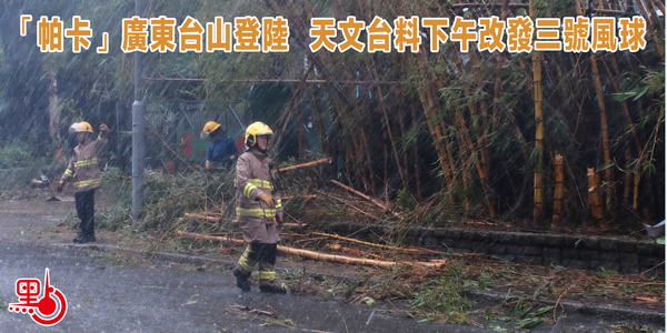 大公文匯全媒體綜合報道:強烈熱帶風暴「帕卡」今日上午9時許在廣東台山市東南部沿海登陸,中心附近最大風力12級。上午5時10分,香港天文台掛起八號風球,預計八號信號會在上午維持,下午改發三號風球。