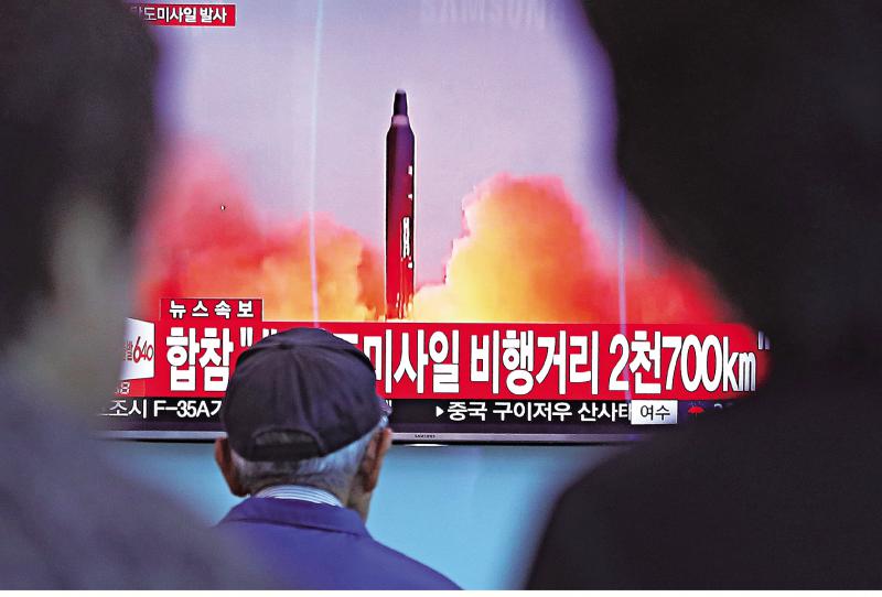 圖:韓國民眾29日在首爾火車站的電視熒屏前佇立,觀看朝鮮發射導彈的新聞 法新社