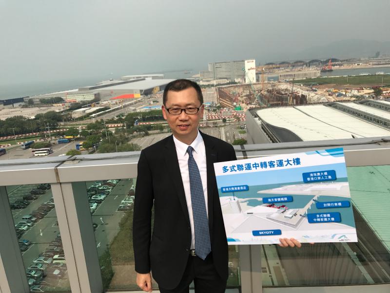 Skypier(圖中的灰色建築)旁的空地為將來多式聯運大樓的位置,圖後為港珠澳大橋人工島旅檢大樓 陳卓康攝