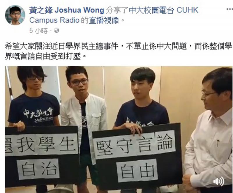 圖:黃之鋒社交網站有新貼文指學界言論自由受打壓雲雲
