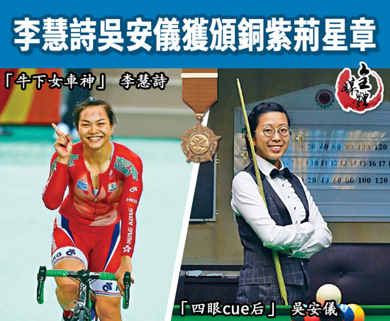 大公文匯全媒體綜合報道 香港2017年度勳銜頒授典禮今日(21日)在禮賓府舉行,行政長官林鄭月娥頒授勳銜和獎狀予331名社會各階層人士。其中,有「牛下女車神」之稱的單車運動員李慧詩,及曾獲多項世界冠軍的「四眼cue后」吳安儀,雙雙獲頒銅紫荊星章。李慧詩成為第二位獲這項榮譽的香港單車運動員;吳安儀則是首位獲此嘉許的香港桌球運動員。