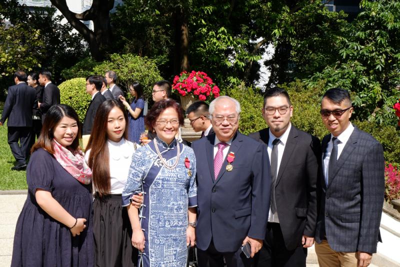 民建聯立法會議員黃定光(象哥)與太太林淑儀,昨日「夫妻檔」一同獲頒授金紫荊星章,他倆聯同家人一起前往禮賓府。